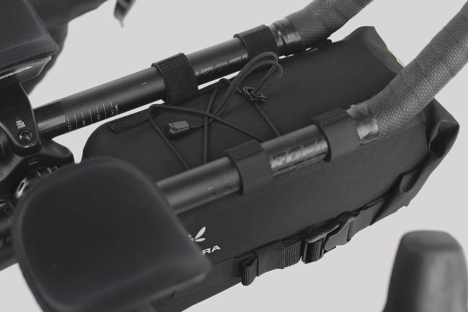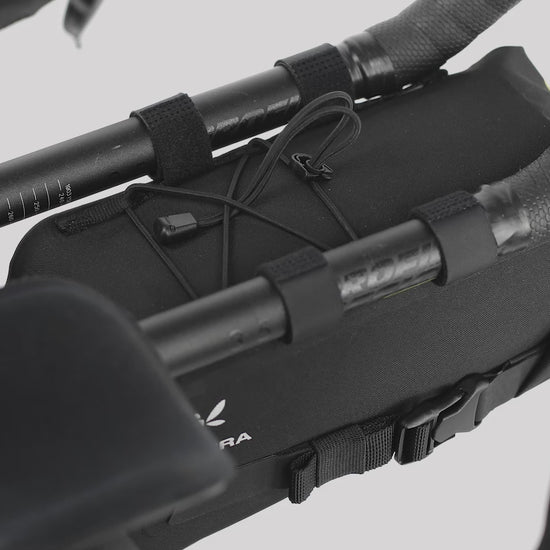 Cette sacoche se fixe solidement sous les barres aero/TT grâce à un système de fixation ajustable compatible avec tous les modèles de bikepacking aero. Le bungee réglable permet de ranger rapidement des objets supplémentaires, tandis que la structure intégrée et renforcée garantit une stabilité optimale pendant les trajets.