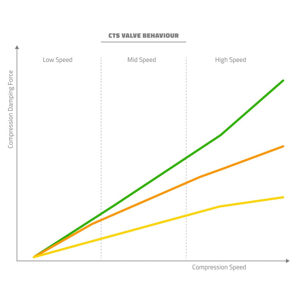 Le système CTS (Compression Tuning System) permet de personnaliser le comportement hydraulique selon votre style de pilotage. Trois valves interchangeables — Gold (souple), Orange (moyenne) et Green (ferme) — sont fournies pour ajuster la compression facilement, sans outils spécifiques. Le Compression Switch à deux positions (Open / Firm) offre un réglage instantané pour passer d’un mode confort à un mode plus ferme en montée ou sur terrain roulant.