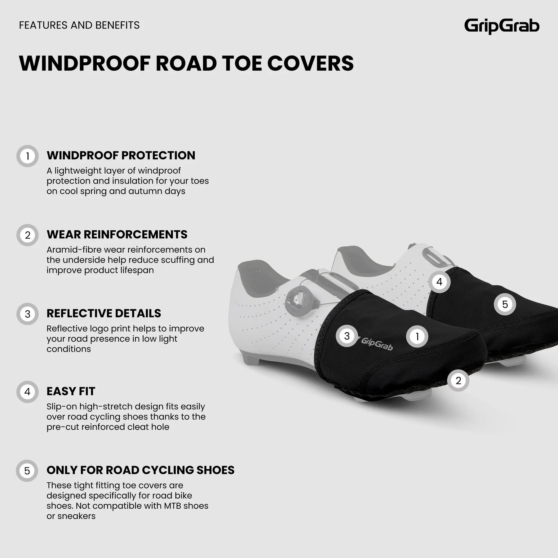 Las punteras GRIPGRAB WINDPROOF son perfectas para el ciclismo de carretera en primavera y otoño. Fáciles de poner, se deslizan rápidamente sobre el calzado para proteger los pies del viento y la lluvia.