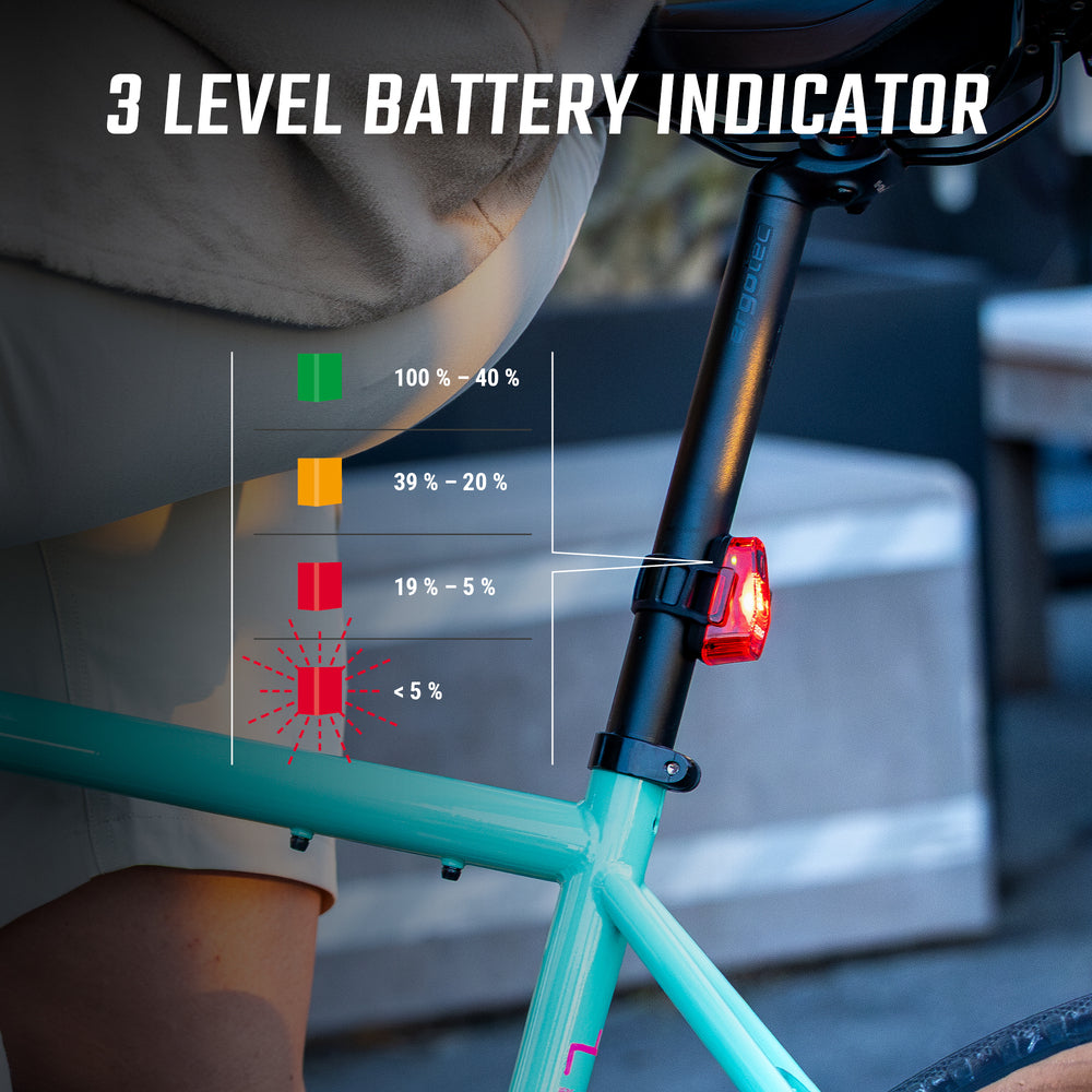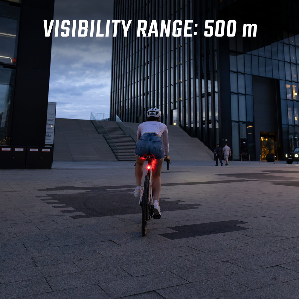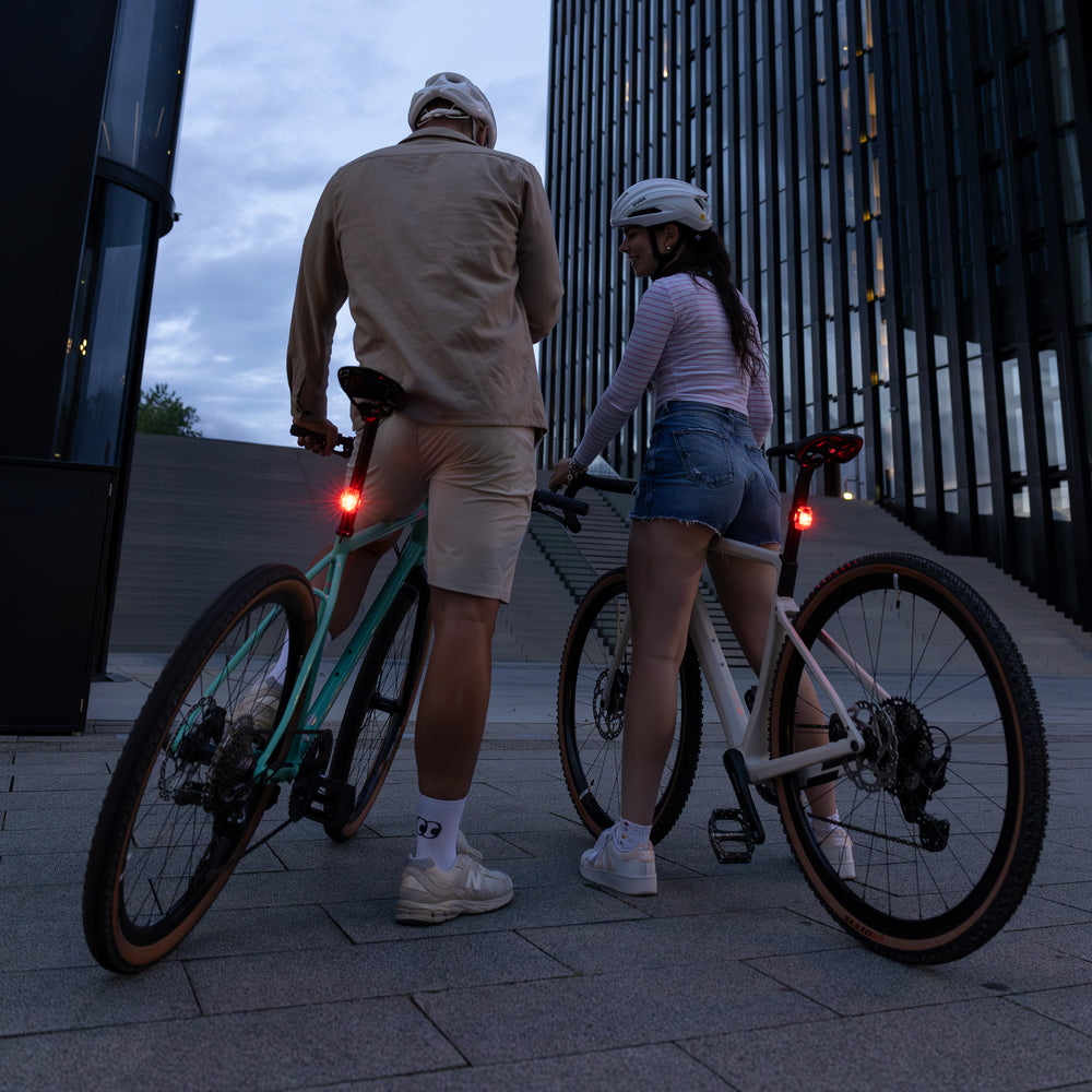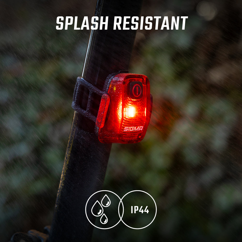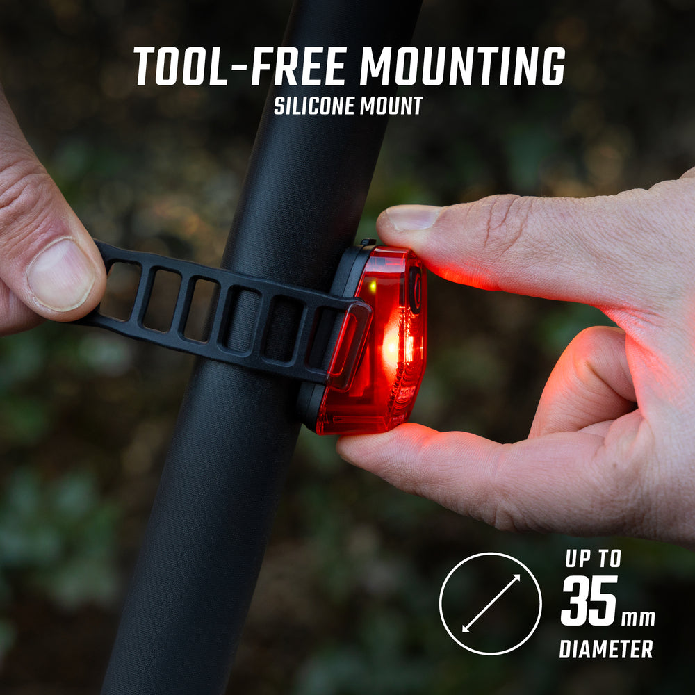 Pensada para los ciclistas urbanos, esta luz trasera se fija rápidamente a cualquier tija gracias a su correa de silicona, sin necesidad de herramientas. Estanca según la norma IP44, resiste a las salpicaduras de agua y te acompañará en tus desplazamientos sean cuales sean las condiciones meteorológicas.