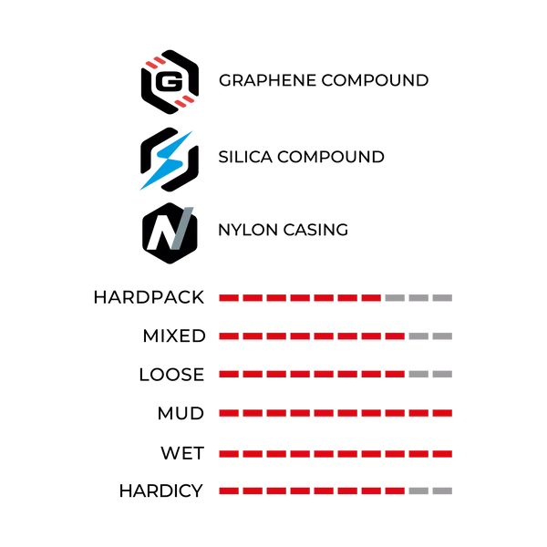 La Mota es un neumático estable que se adapta a una amplia gama de condiciones. El perfil de los tacos proporciona un agarre perfecto sin comprometer la velocidad, para una conducción rápida y técnica.